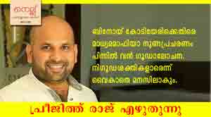 ബിനോയിയുടേയും കോടിയേരി ബാലകൃഷ്ണന്റേയും പേരോട് കൂടിയ പരാതിയാണ് ലഭിച്ചതെങ്കിലും മലയാള മനോരമയുടെ വാര്ത്തയില് സിപിഐ എം സംസ്ഥാന സെക്രട്ടറിയുടെയോ, അദ്ദേഹത്തിന്റെ മകനായ ബിനോയിയുടെയോ പേര് പരാമര്ശിക്കുന്നില്ല. ഉന്നതനായ സിപിഎം നേതാവിന്റെ മകനെന്ന് മാത്രമേ ആ വര്ത്തയില് പറയുന്നുള്ളു. കാരണം ആ പരാതിയില് കഴമ്പില്ലെന്നും അത് നിലനില്ക്കില്ലെന്നും മനോരമയ്ക്ക് നന്നായി അറിയാം. എന്നിട്ടും അത് വാര്ത്തയാക്കുന്നിടത്താണ് ഗൂഡാലോചന ഉണ്ടെന്ന് സംശയിക്കേണ്ടത്. മനോരമയുടെ വാര്ത്തയില് പേരുകളില്ലെങ്കിലും ഇന്ന് പുലര്ച്ചെ പുറത്തിറങ്ങിയ ഓണ്ലൈന് മാധ്യമങ്ങളും ദൃശ്യമാധ്യമങ്ങളും കോടിയേരിയുടെയും ബിനോയിയുടെയും പേര് ഒരു മടിയുമില്ലാതെ വലിച്ചിഴച്ചു. ചാനല് ചര്ച്ചകള് കൊഴുത്തു. ഇതിനിടയില് കോടിയേരിയെ മാധ്യമ പ്രവര്ത്തകര് വളഞ്ഞു. മകന്റെ പേരില് കേസൊന്നും ഇല്ലെന്ന് അദ്ദേഹം അവരോട് വ്യക്തമാക്കി. മകന് വിശദീകരണം തരുമെന്നും കോടിയേരി പറഞ്ഞു. വൈകാതെ ബിനോയി തന്റെ വിശദീകരണം പത്രകുറിപ്പായി മാധ്യമങ്ങളിലെത്തിച്ചു. ''എന്റെ പേരില് ദുബായില് കേസുണ്ടെന്നും ദുബായില് ട്രാവല്ബാന് ഏര്പ്പെടുത്തിയിട്ടുണ്ടെന്നും ചില മാധ്യമങ്ങളില് വന്ന വാര്ത്ത വസ്തുതാ വിരുദ്ധമാണ്. എന്റെ പേരില് ദുബായില് ഇപ്പോള് യാതൊരു വിധ കേസുമില്ല. ഞാന് അവിടെ നടത്തിയ ബിസിനസുമായി ബന്ധപ്പെട്ട് പാര്ട്ണറുമായി ഒരു ചെക്ക് കേസ് ഉണ്ടായിരുന്നു. അത് കോടതി വഴി പരിഹരിക്കപ്പെട്ടതാണ്. ഇപ്പോള് ആരോപിക്കുന്നത് പോലുള്ള യാതൊരു സംഭവവും എന്റെ പേരില് ഇല്ല. വസ്തുതാ വിരുദ്ധമായ ഇത്തരം വാര്ത്തകള് നല്കുന്നതിന്റെ അടിസ്ഥാനമെന്താണെന്ന് വ്യക്തമല്ല. അത് ദുരുദ്ദേശപരമാണ്.'' ബിനോയിയുടെ ഈ വിശദീകരണം പോലും മുഖവിലക്കെടുക്കാതെ വ്യാജപരാതിയുടെ മുകളില് മാധ്യമങ്ങള് ഇപ്പോഴും ചര്ച്ച നടത്തുകയാണ്. ഇതാണോ മാധ്യമ നീതി?